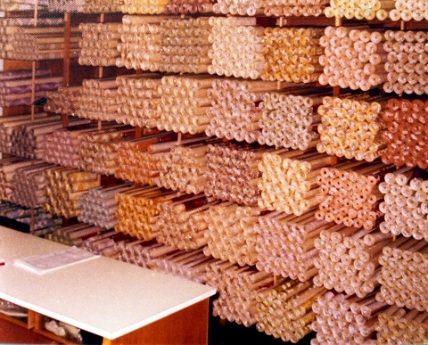 Rupfen bespannt und den Wänden der Kosmetikabteilung, die mit cognacfarbendem Rupfen verkleidet sind.