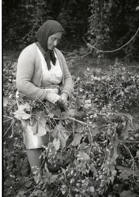 Eine Hopfenpflückerin bei der Arbeit