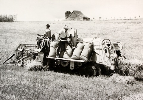 Stiefvater Otto Späth mit dem Mähdrescher Claas Europa beim Korndreschen